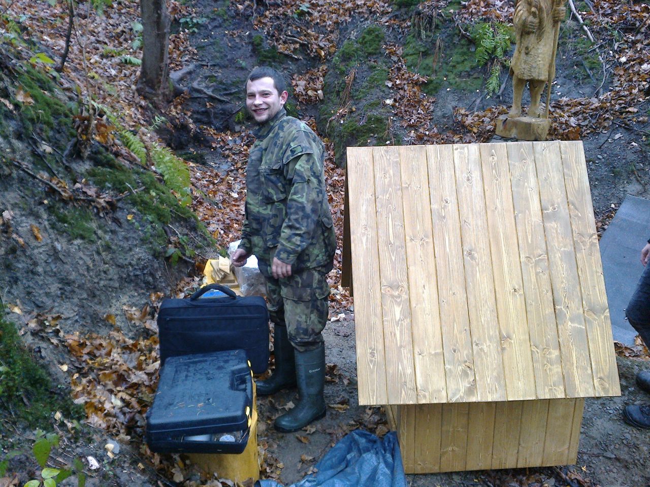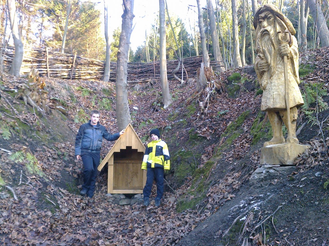 Sochu Skřeta, kterou na Řezbářském sympoziu v Klimkovicích vytvořil polský řezbář Francziszek Piecha, a která vyhrála Cenu diváka, jsme na připravený podstavec umístili v podstatě snadno. Její váhu odhadujeme na cca 80kg, takže i přes příkrý terén a nesnadnou manipulaci, si s tím ručně poradilo pár kluků.